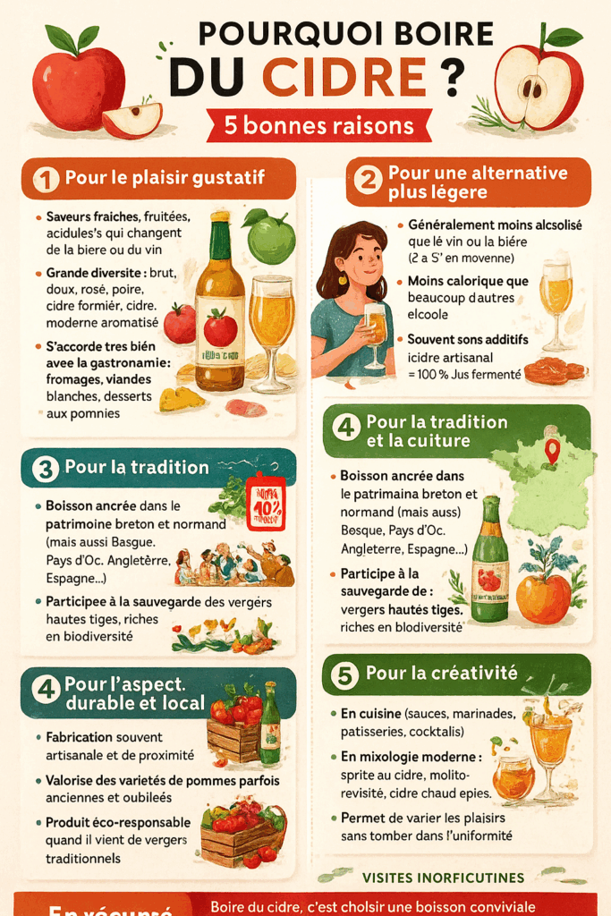 Très bonne question 🤔 ! On pourrait répondre à “pourquoi boire du cidre ?” sous plusieurs angles : plaisir, culture, santé, environnement. Voici une synthèse claire :