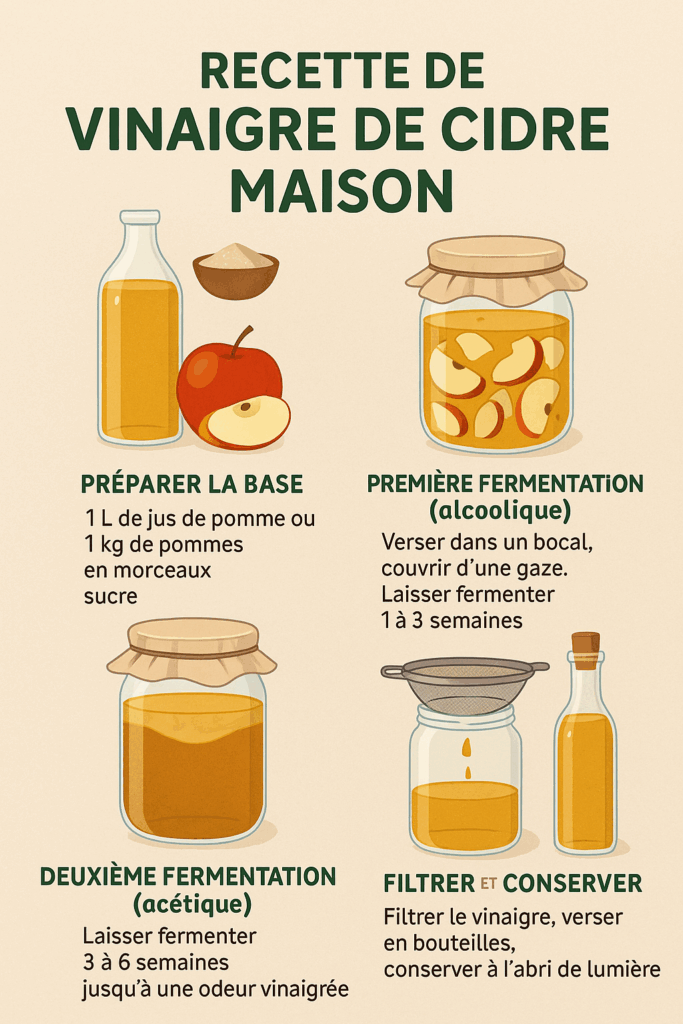 Voici une méthode simple et artisanale pour fabriquer votre vinaigre de cidre maison à partir de pommes ou de jus de pomme 🌱 Ingrédients 🔄 Étapes 1. Préparer la base 2. Première fermentation (alcoolique) 3. Deuxième fermentation (acétique) 4. Filtrer et conserver ⏳ Temps total 👉 Environ 2 à 3 mois pour obtenir un vinaigre …